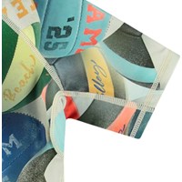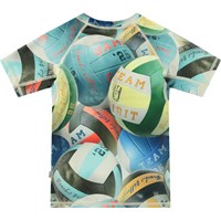 Bade t-shirt til aktive børn fremstillet af genanvendt polyester med UV-beskyttelse 50+. T-shirten har en tætsiddende pasform, opstående krave og korte raglanærmer. Den er behagelig at have på takket være det strækbare materiale. T-shirten har et farverigt allover print af volleybolde. Produktet er CE-mærket og testet i henhold til standard: EN-13758-1.