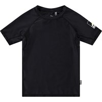 Sort bade t-shirt til aktive børn, fremstillet af genanvendt polyester med UV-beskyttelse 50+. Blusen har en tætsiddende pasform, opstående krave, korte raglanærmer og er behagelig at have på i det strækbare materiale. Produktet er CE-mærket og testet i henhold til standard: EN-13758-1.