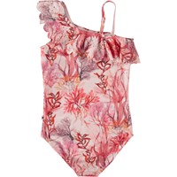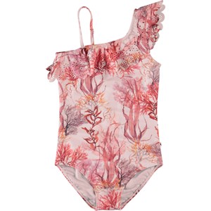 Net er en lyserød badedragt med print af havets flora. Net er asymmetrisk, med en skrå flæsekant, som går op på den ene skulder, mens der er en enkelt skulderstrop i den anden side. Molo's badetøj har UV beskyttelse 50+. Produktet er CE-mærket og testet i henhold til standard: EN-13758-1.