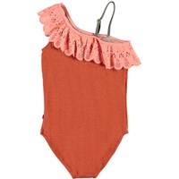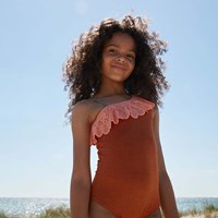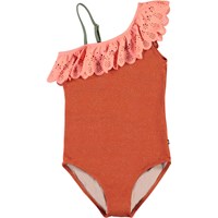 Net er en flot badedragt i rustrød med fin guldtråd, lyserød flæsekant og grøn skulderstrop. Net er asymmetrisk, med en skrå flæsekant, som går op på den ene skulder, mens der er en enkelt skulderstrop i den anden side. Molo's badetøj har UV beskyttelse 50+. Produktet er CE-mærket og testet i henhold til standard: EN-13758-1.