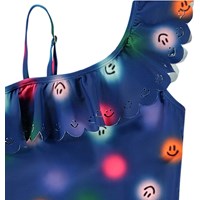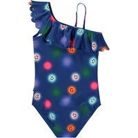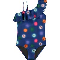 Badedragt til aktive børn i genanvendt polyester med UV-beskyttelse 50+. Badedragten har en almindelig pasform, er helforet og har en asymmetrisk bølget flæse samt en tynd justerbar strop, der sikrer en god pasform. Badedragten er blå med et allover-print af farverige, smilende prikker. Produktet er CE-mærket og testet i henhold til standard: EN-13758-1.