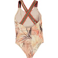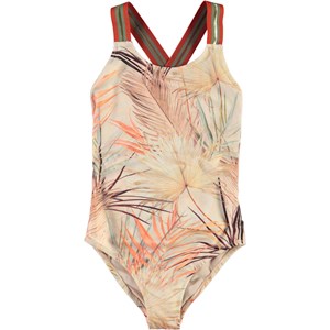 Neve er en rosa badedragt med fint palmeprint og brede stribede stropper i guld og rød som krydser på ryggen. Molo's badetøj har UV beskyttelse 50+. Produktet er CE-mærket og testet i henhold til standard: EN-13758-1.