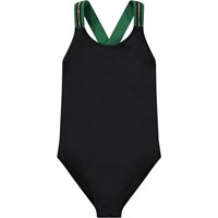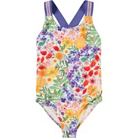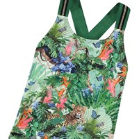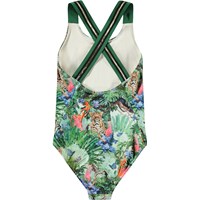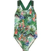 Sporty badedragt til aktive børn i genanvendt polyester med UV-beskyttelse 50+. Badedragten har en almindelig pasform, er helforet og har brede elastikstropper med glimmer, der krydser på den dybe ryg. Den er grøn med et farverigt jungleprint over hele dragten. Produktet er CE-mærket og testet i henhold til standard: EN-13758-1.