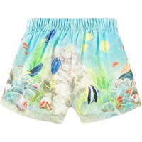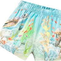 Sporty badeshorts til de mindste, fremstillet af genanvendt polyester med UV-beskyttelse 50+. Badeshortsene har en løs pasform, indvendig snøre, sidelommer samt bløde mesh-indershorts. Shortsene er lyseblå med et print af farverige fisk og havskildpadder. Produktet er CE-mærket og testet i henhold til standard: EN-13758-1.