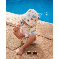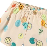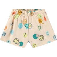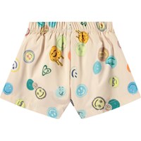 Sporty badeshorts til de mindste, fremstillet af genanvendt polyester med UV-beskyttelse 50+. Badeshortsene har en løs pasform, indvendig snøre, sidelommer samt bløde mesh-indershorts. Shortsene er beige med et allover-print af farverige, smilende ansigter. Produktet er CE-mærket og testet i henhold til standard: EN-13758-1.