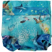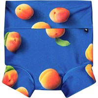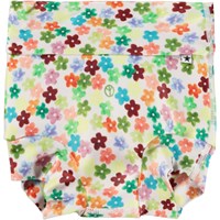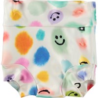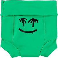 Grønne, lækagefri blebadebukser med placeret frontprint af en glad emoji med palme-øjne. Badebukserne er foret og har en elastisk, tætomsluttende pasform, der sikrer, at de holder tæt, hvis uheldet skulle være ude. Dette betyder, at de kan bruges uden en almindelig engangsbadeble. De er fremstillet af genanvendt polyester og yder en høj UV-beskyttelse på 50+, der effektivt beskytter mod solens stråler. Produktet er CE-mærket og testet i henhold til standard: EN-13758-1.