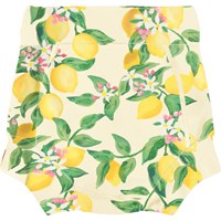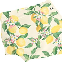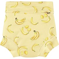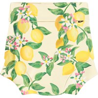Lækagefri badebukser i gul med citrusprint, fremstillet af genanvendt polyester med UV50+ beskyttelse. Helforede med tætsiddende pasform, der slutter tæt om lår og mave – kan bæres uden badeble.