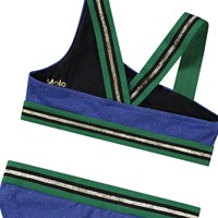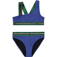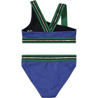Asymmetrisk sporty bikini til aktive børn med UV-beskyttelse 50+. Bikinien har en bred overdel og brede elastikstropper, som krydser på ryggen, samt en elastik i bunden, der hjælper med at holde toppen på plads. Underdelen har en bred elastik i taljen, en almindelig pasform og er helforet. Bikinien er blå med indvævet glimmersnor og har grønne og guldglimmer stropper. Produktet er CE-mærket og testet i henhold til standard: EN-13758-1.