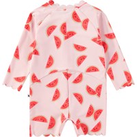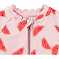 Badedragt med lange ærmer og korte ben til de mindste, lavet af genanvendt polyester og med UV-beskyttelse 50+. Badedragten har en lynlås på fronten, hvilket gør den nem at tage af og på. Den har bløde bølgekantede detaljer og god plads til en ble. Dragten er lyserød med et allover print af solmodne vandmelonstykker. Produktet er CE-mærket og testet i henhold til standard: EN-13758-1.