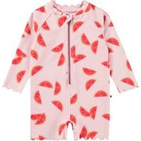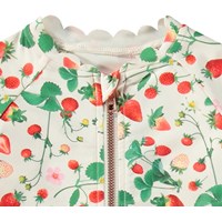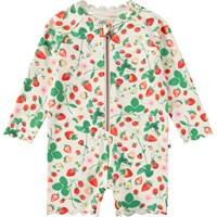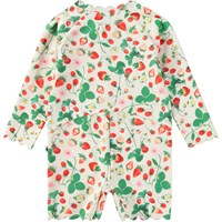 Badedragt med lange ærmer og korte ben til de mindste, lavet af genanvendt polyester med UV-beskyttelse 50+. Badedragten har en lynlås foran, hvilket gør den nem at tage af og på. Den har bløde bølgekantdetaljer og god plads til en ble. Dragten er hvid med et allover print af friske jordbærplanter. Produktet er CE-mærket og testet i henhold til standard: EN-13758-1.