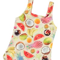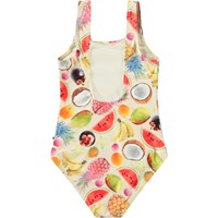 Sporty badedragt til aktive børn i genanvendt polyester med UV-beskyttelse 50+. Badedragten har en almindelig pasform, er helforet, har brede stropper og en dyb ryg. Den er beige med et allover print af farverige, eksotiske frugter. Produktet er CE-mærket og testet i henhold til standard: EN-13758-1.