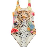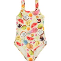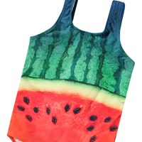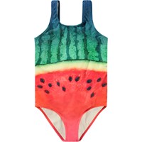 Sporty badedragt til aktive børn i genanvendt polyester med UV-beskyttelse 50+. Badedragten har en almindelig pasform, er helforet, har brede stropper og en dyb ryg. Printet på badedragten forestiller en stor, solmoden vandmelon. Produktet er CE-mærket og testet i henhold til standard: EN-13758-1.
