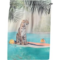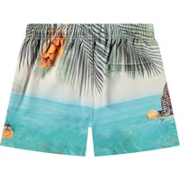Sporty badeshorts til aktive børn i genanvendt polyester med UV-beskyttelse 50+. Shortsene har en løs pasform, går til midt på låret, har en enkel baglomme, elastik og snøre i taljen samt indershorts i blødt mesh. Shortsene har et print af en strand med en gepard på et surfboard. Produktet er CE-mærket og testet i henhold til standard: EN-13758-1.