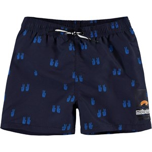 Niko er et par sporty badeshorts i mørkeblå med blå tegnede hænder, der laver fredstegn. Niko har elastisk talje med bindebånd, som sikrer en god bevægelighed. Kombiner badeshortsene med en matchende t-shirt. Molo's badetøj har UV beskyttelse 50+. Produktet er CE-mærket og testet i henhold til standard: EN-13758-1.