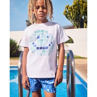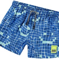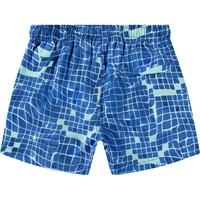 Sporty badeshorts til aktive børn i genanvendt polyester med UV-beskyttelse 50+. Shortsene har en løs pasform, går til midt på låret, har en enkel baglomme, elastik og snøre i taljen samt indershorts i blødt mesh. Shortsene har et allover-print af en poolbund i blå nuancer, der smiler til dig. Produktet er CE-mærket og testet i henhold til standard: EN-13758-1.