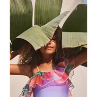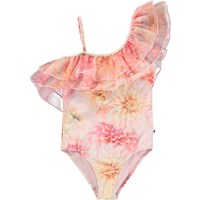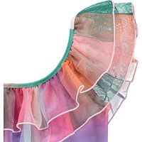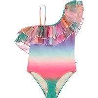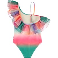 Regnbuefarvet badedragt i genanvendt polyester med UV-beskyttelse 50+. Badedragten har en almindelig pasform, er helforet og har en asymmetrisk chiffonflæse samt en tynd justerbar strop, der sikrer en god pasform. Produktet er CE-mærket og testet i henhold til standard: EN-13758-1.