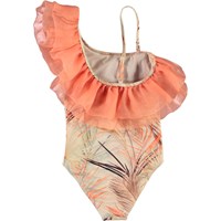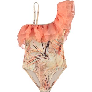 Nilla er Molo’s nye asymmetriske og skulpturelle badedragt med stor og flot dobbeltlags sifonkrave, der bevarer pasformen, ikke suger vand når den bliver våd og tørrer lige så hurtigt som resten af badedragten. Her med ferskenfarvet krave og flot grafisk palmeprint på dragten. Molo's badetøj har UV beskyttelse 50+. Produktet er CE-mærket og testet i henhold til standard: EN-13758-1.