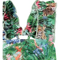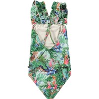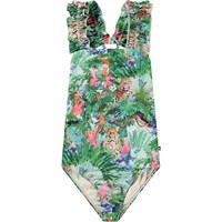 Badedragt til aktive børn i genanvendt polyester med UV-beskyttelse 50+. Badedragten har en almindelig pasform, brede stropper, der krydser på den dybe ryg, og er helforet. Den er grøn med et farverigt jungleprint. Produktet er CE-mærket og testet i henhold til standard: EN-13758-1.