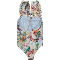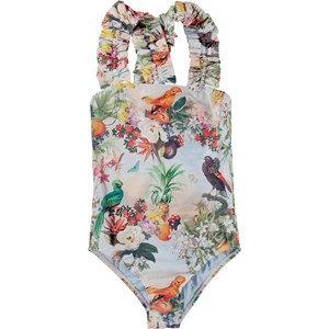 Nitika er en badedragt i lyseblå med print af tropiske fugle, blomster og frugter. Badedragten har brede draperede stropper, som krydser på ryggen. Molo's badetøj har UV beskyttelse 50+. Produktet er CE-mærket og testet i henhold til standard: EN-13758-1.
