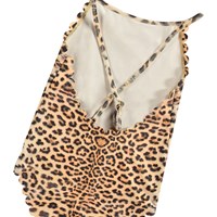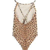 Badedragt i gepardprint til aktive børn i genanvendt polyester med UV-beskyttelse 50+. Badedragten har en almindelig pasform, bløde bølgede kanter, er helforet og har en dyb ryg med justerbare, smalle stropper, der krydser på ryggen. Stopperne er justerbare fra størrelse 140 og opefter. Produktet er CE-mærket og testet i henhold til standard: EN-13758-1.