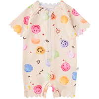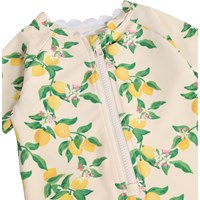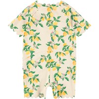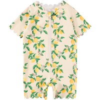 Gul badedragt med citrusprint til de mindste, i genanvendt polyester med UV-beskyttelse 50+. Med korte ærmer og ben, praktisk frontlynlås, bløde bølgekantdetaljer og god plads til ble.