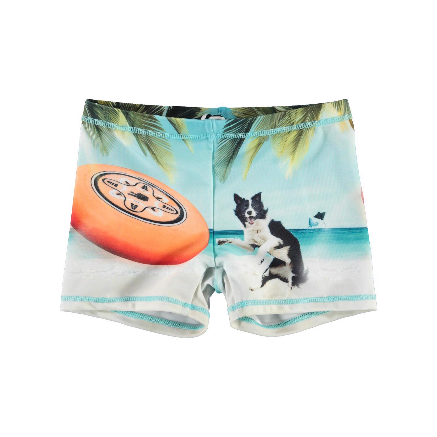 Norton er et par korte badebukser med print af en hund i færd med at gribe en frisbee. Badebukserne har et indvendigt bindebånd og en god bevægelighed. Mix og match med matchende t-shirt for ekstra beskyttelse af overkroppen. Molo's badetøj har UV beskyttelse 50+. Produktet er CE-mærket og testet i henhold til standard: EN-13758-1.