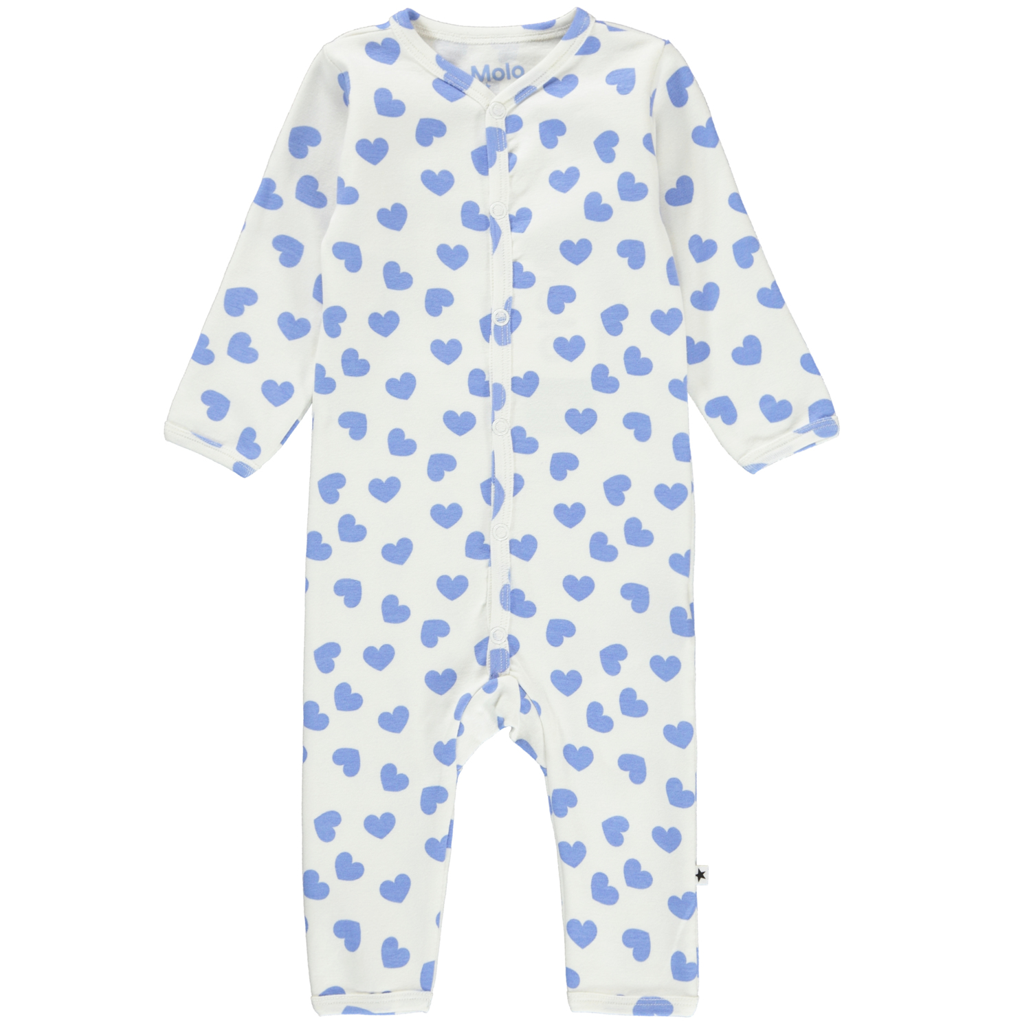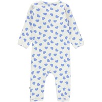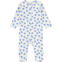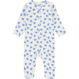 Fahari er en hvid babydragt med print af blå hjerter. Dragten har lange ben og ærmer, samt trykknapper ved hals og ben gør det let at få dragten af og på.