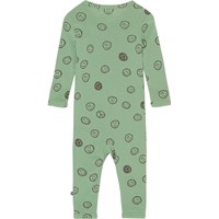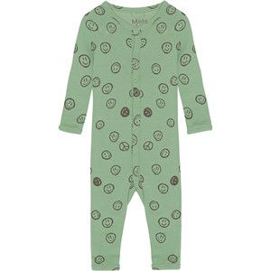 Grøn babydragt i allover print. Printet består af små smilende ansigter og peacetegn. Denne dragt er fremstillet i 100% Merino uld, har lange ærmer, lange ben og trykknapper ned gennem fronten.
