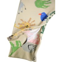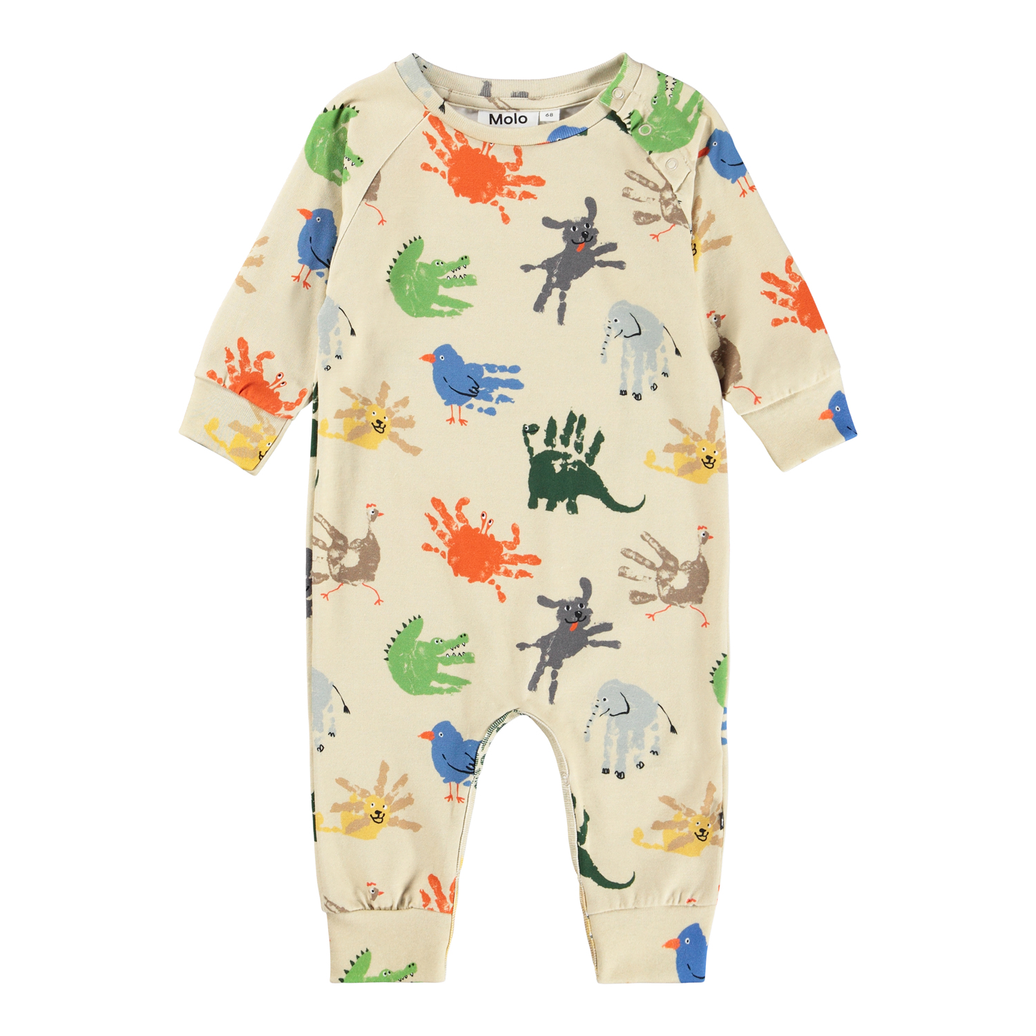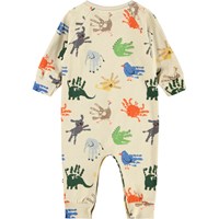 Beige heldragt i blødt økologisk bomuld med håndprint af dyr til de mindste. Dragten har lange ærmer og ben samt trykknapper på den ene skulder og mellem benene, hvilket gør den nem at tage af og på. Den er løs og har ribkanter i ærmerne og benene, hvilket gør den behagelig at have på og giver masser af bevægelsesfrihed.