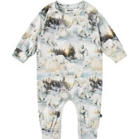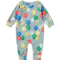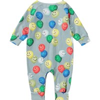 Multifarvet heldragt i økologisk bomuldsjersey med lange ærmer og ben. Trykknapper på den ene skulder og mellem benene gør den nem at få af og på. Tætsiddende pasform med ribkanter ved ærmer og ben. Alloverprint af glade balloner i forskellige farver på grå baggrund.