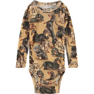 Brun langærmet body i merinould med print af gravhunde. Denne body har trykknap i kraven og mellem benene, der gør det nemt at få bodyen af og på.