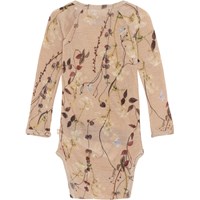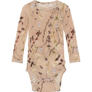 Farai er en rosa babybody i 100% Merino uld med print blomsterranker. Farai har trykknap i kraven og mellem benene, som gør det nemt at få bodyen af og på.