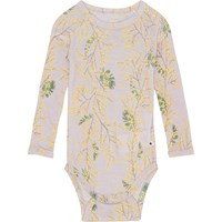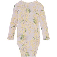 Lys lilla babybody i allover print. På printet ses de fineste gule mimosa blomsterrænker. Denne body er fremstillet i 100% Merino uld, har lange ærmer og trykknap i kraven og mellem benene, som gør det nemt at få bodyen af og på. Match evt. denne body med bukserne, Sting, i samme print.