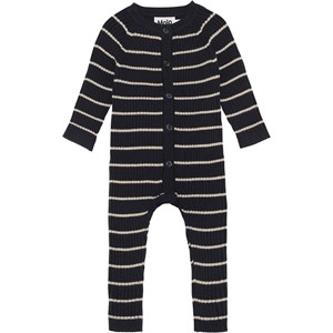 Farley er en strikket blå babydragt med hvide striber. Dragten er i 80% bomuld og 20% uld og har lange ærmer og ben, samt knapper ned langs fronten.