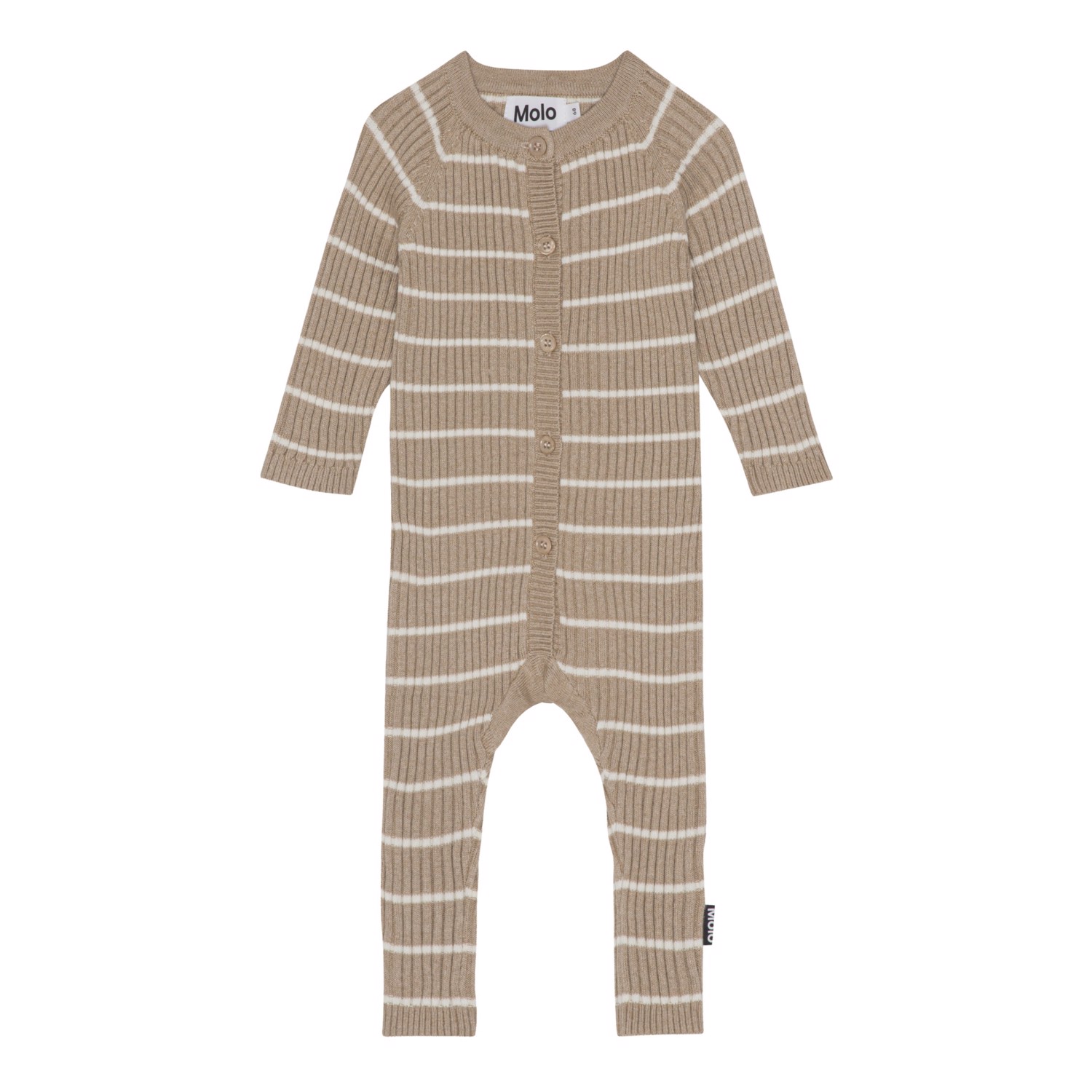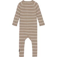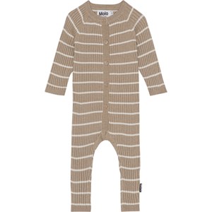 Beige babydragt med hvide striber og raglanærmer. Denne dragt er fremstillet i den blød bomuld/uld blanding, har en rund halsudskæring, lange ben og ærmer, samt knaplukning foran.