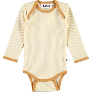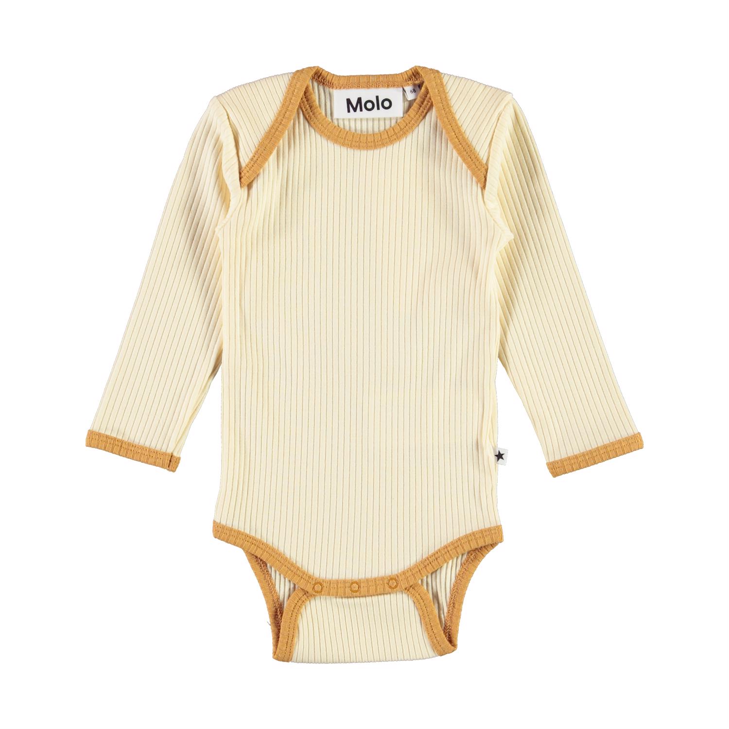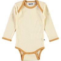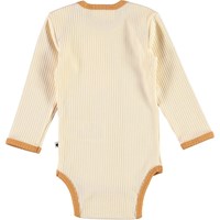 Faros er en beige langærmet baby body i rib med honning farvet kantbånd. Trykknapper mellem benene, gør det let at få bodyen af og på. Baby essentials.