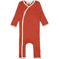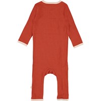 Fellow er en mørkerød baby body i rib kvalitet med lyserøde kantbånd. Bodyen har en fin v-hals som fortsætter ud i en knappelukning af trykknapper ned langs den ene side af bodyen.