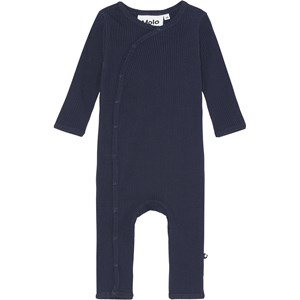 Fellow er en mørkeblå babydragt i rib kvalitet. Dragten har en fin v-hals som fortsætter ud i en knappelukning af trykknapper ned langs den ene side af bodyen.