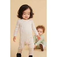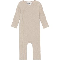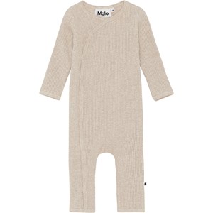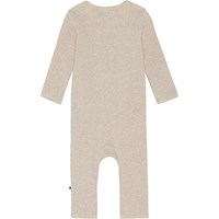 Fellow er en beige babydragt i rib kvalitet. Dragten har en fin v-hals som fortsætter ud i en knappelukning af trykknapper ned langs den ene side af bodyen.