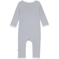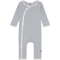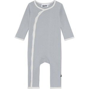Fellow er en lys gråblå babydragt i rib med lange ærmer og ben, samt hvide farvede kantbånd. Dragten har en fin v-hals som fortsætter ud i en knappelukning af trykknapper ned langs den ene side af dragten.  Certificeret af Ecocert Greenlife, certifikationsnummer 197496.