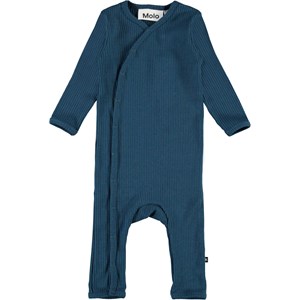 Fellow er en mørkeblå baby body i rib kvalitet. Bodyen har en fin v-hals som fortsætter ud i en knappelukning af trykknapper ned langs den ene side af bodyen.