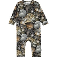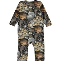Fenez er en babydragt med lange ben og ærmer og print af sovende dyr. Trykknapper ved hals og ben gør det let at få dragten af og på.
