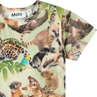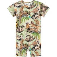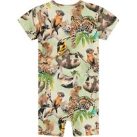 Heldragt i økologisk bomuldsjersey til de mindste. Heldragten har korte ærmer og ben samt knaplukning på skulderen og mellem benene, hvilket gør den nem at få af og på. Dragten har en rummelig pasform med masser af plads til bevægelse, samt print af dyreunger i junglen.