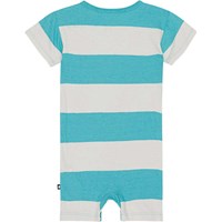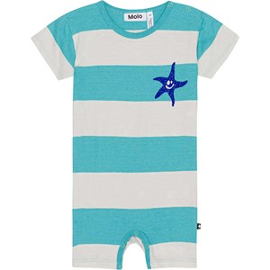 Stribet heldragt med t-shirt ærmer i blødt bomuld. Dragten har trykknapper på skulder samt mellem benene, som gør den nemt at få af og på. Dragten har en løs pasform med masser af bevægelighed. Dragten har sandfarvet og petroleumsblå brede striber samt et sødt print på brystet af en søstjerne.