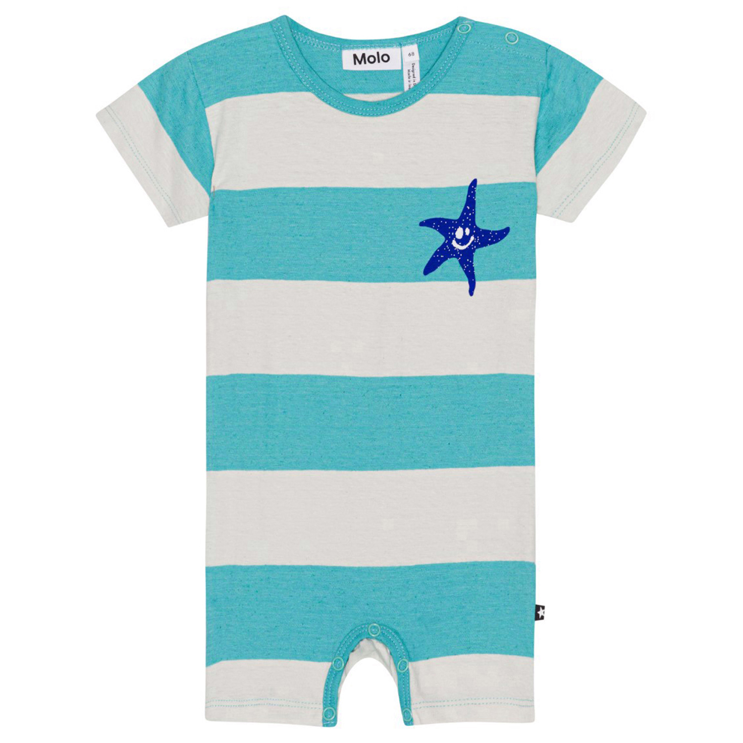 Stribet heldragt med t-shirt ærmer i blødt bomuld. Dragten har trykknapper på skulder samt mellem benene, som gør den nemt at få af og på. Dragten har en løs pasform med masser af bevægelighed. Dragten har sandfarvet og petroleumsblå brede striber samt et sødt print på brystet af en søstjerne.