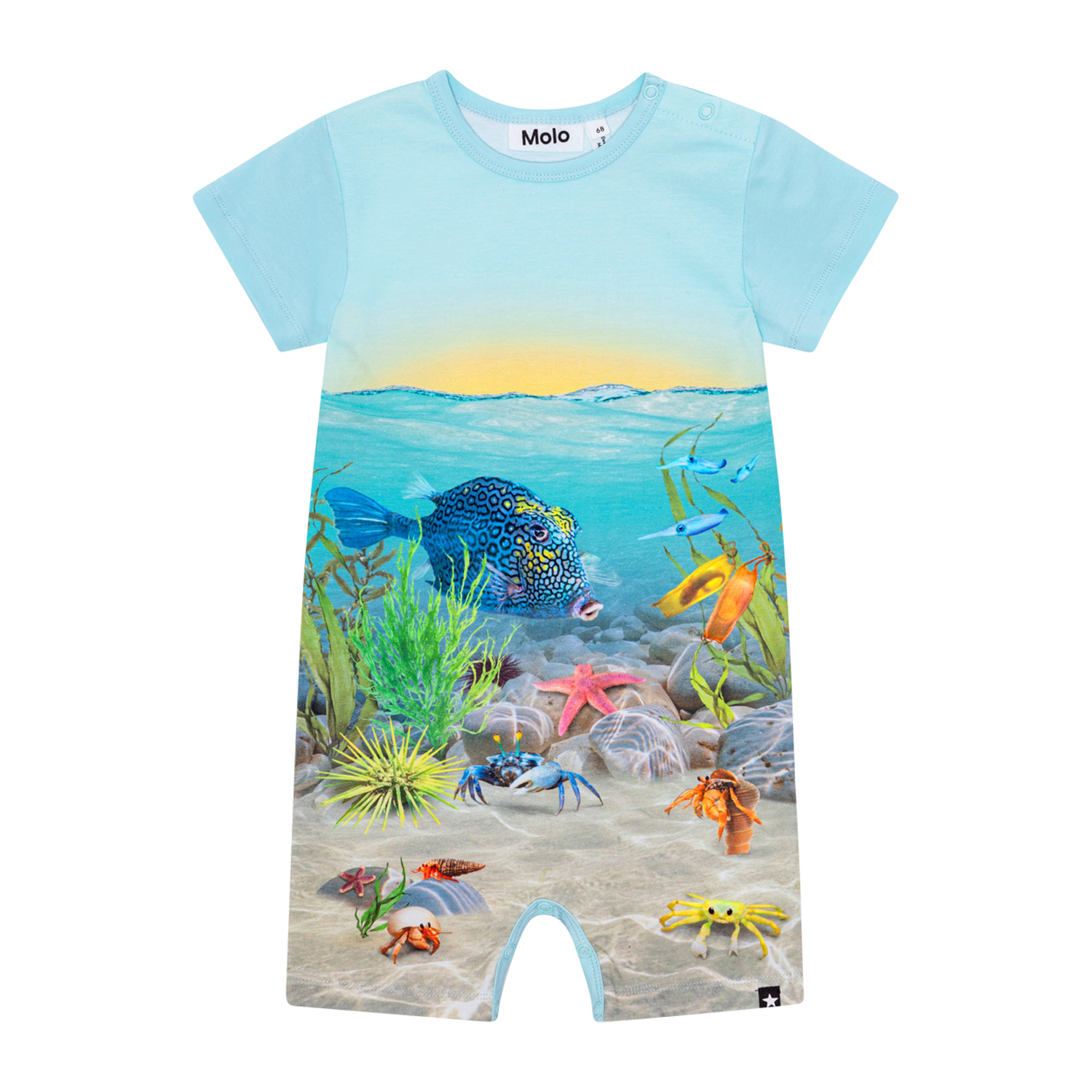 Blå heldragt med t-shirt ærmer i økologisk bomuld. Dragten har trykknapper på den ene skulder samt mellem benene, som gør den nemt at få af og på. Dragten har en løs pasform med masser af bevægelighed. Dragten har et frontprint af en solnedgang og et kig ind i havets bund med farverige fisk og planter.