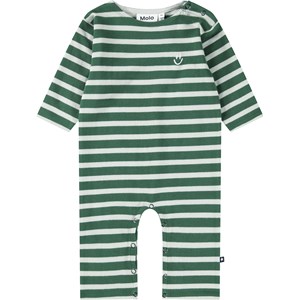 Heldragt i økologisk bomuld til de mindste med brede grønne striber og hvidt broderet smilende ansigt på brystet. Dragten har lange ærmer og ben samt knaplukning ved skulderen og mellem benene, hvilket gør den nem at få af og på.