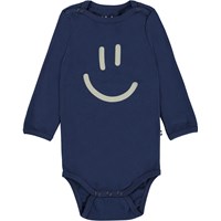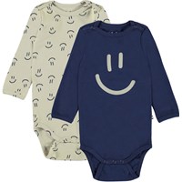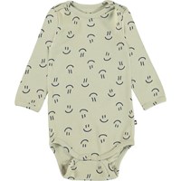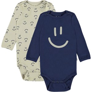 Foss er en langærmet babybody. Her fåes Foss i en 2-pack, som indeholder både en en beige med print af små smileyer og en blå body med stort print af en smiley. Trykknapper ved hals og mellem ben, gør det let at få bodyen af og på.