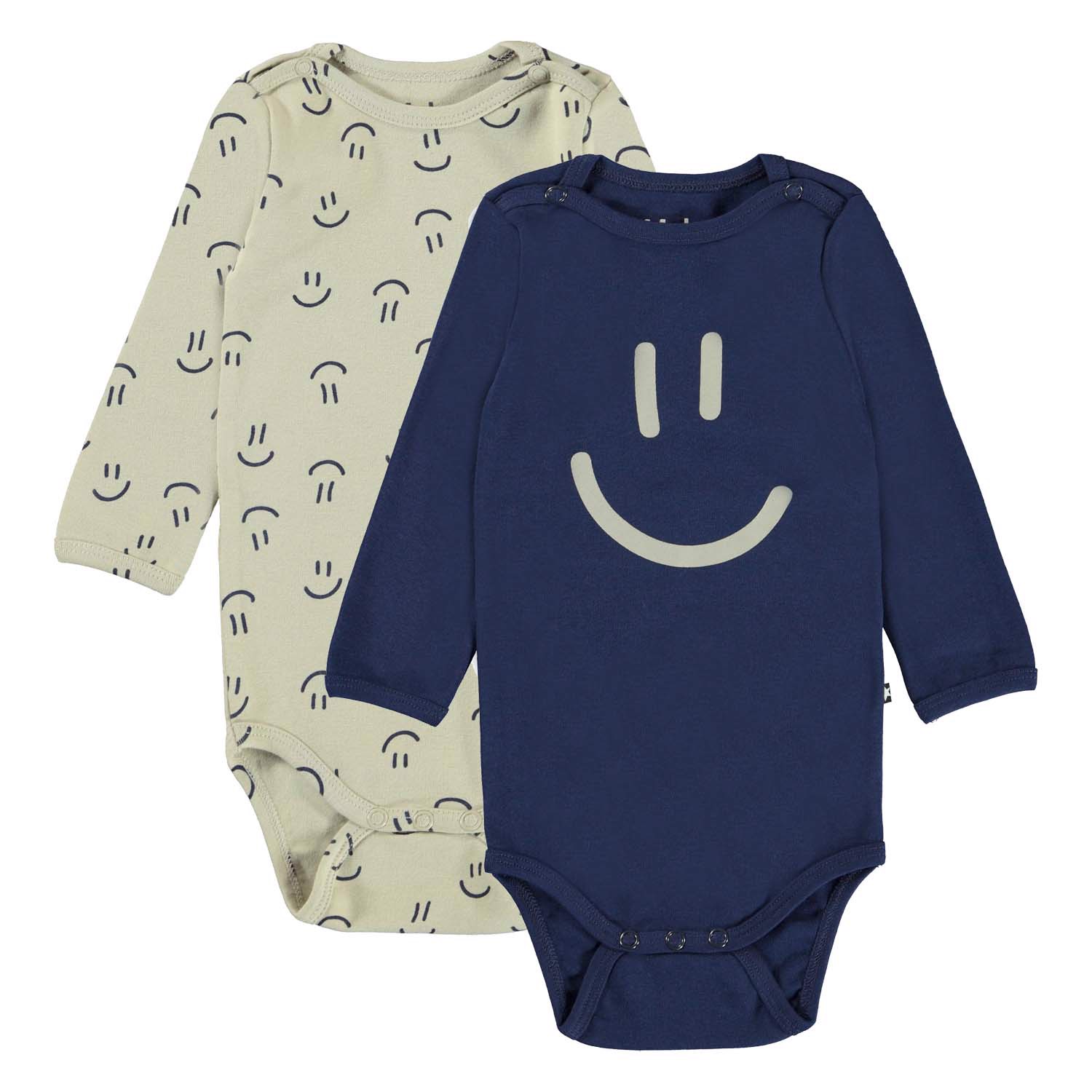 Foss er en langærmet babybody. Her fåes Foss i en 2-pack, som indeholder både en en beige med print af små smileyer og en blå body med stort print af en smiley. Trykknapper ved hals og mellem ben, gør det let at få bodyen af og på.