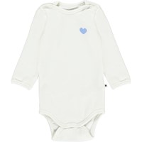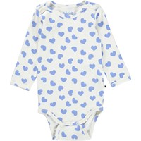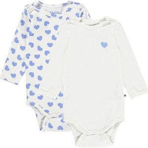 Foss er en langærmet babybody. Her fåes Foss i en 2-pack, som indeholder både en hvid og en med print af lyseblå hjerter. Trykknapper ved hals og mellem ben, gør det let at få bodyen af og på.